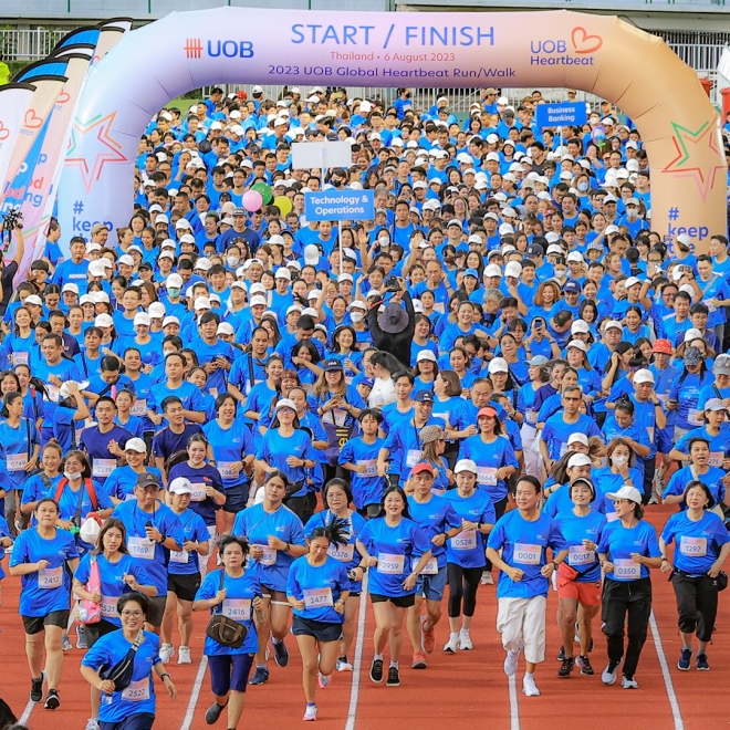 ธนาคารยูโอบี ประเทศไทย นำทีมพนักงาน พันธมิตรธุรกิจ และลูกค้า กว่า 2,500 คน ร่วมส่งต่อความดีในกิจกรรมเดิน-วิ่ง 2023 UOB Global Heartbeat Run/Walk ณ สนามศุภชลาศัย ซึ่งเป็นกิจกรรมอาสาและระดมทุนเพื่อสังคมที่กลุ่มธนาคารยูโอบีจัดขึ้นอย่างต่อเนื่องเป็นประจำทุกปี โดยในปีนี้จัดขึ้นใน 18 ประเทศทั่วโลก